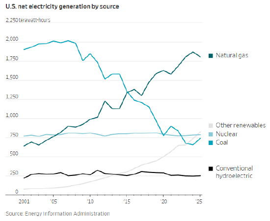 煤炭曾是美国最大的发电燃料,但在 2008 年前后开始急剧下滑。页岩革命带来的国内天然气供应激增、廉价可再生能源的冲击,以及各州环保政策,共同加速了煤炭的退场,数百座电厂关闭。