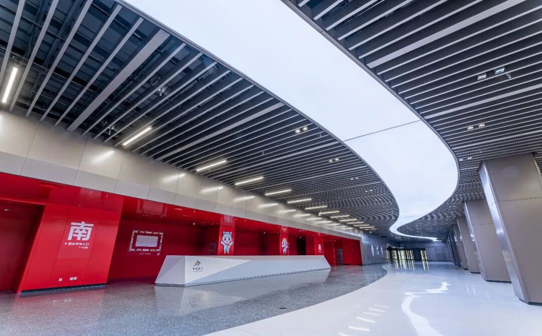 凭借最新影像技术,这片“天幕”可配合现场声光电,与冰场达成天地呼应视觉效果。穿孔铝单板及蜂窝铝板投入使用,再联合BIM三维放线技术,妥善解决超高空间施工难题,最终把“最美的冰”这一设计理念化作现实。