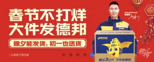 跟在后面的是德邦快递,它于1月10日发布了一则公告,公告内容为“除夕能发货,初一也送货”。在2月10日至17日春节期间,它不会停止营业,在其他日期则提供常态寄递服务。首席体验官易建联打出了一条标语,标语内容是“超过3公斤大件发德邦”,此标语是专门针对年货大件的寄递需求的。