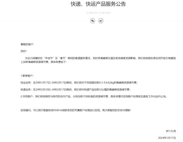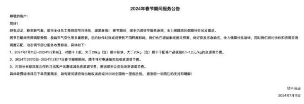 顺丰速运的费用调整更为细致,在1月11日至2月9日期间,对于顺丰卡航、超过20公斤的顺丰标快等产品,要收取每公斤0.1到1.2元的资源调节费。在2月10日至17日春节假期阶段,所有寄递服务均需加收这笔费用,且小件与大件的收费标准有所不同。