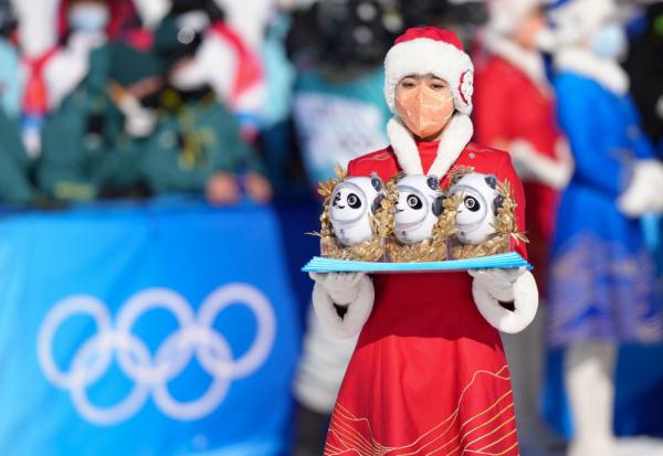 宣布颁奖的时刻,同样饱含着满满的中国元素,礼仪人员身着“瑞雪祥云”服饰,穿戴“鸿运山水”服饰,穿着“唐花飞雪”服饰,托起恰似同心圆形玉璧的冬奥奖牌,从服饰方面到配乐方面,从竞技之时到颁奖之时,古老的文明与奥林匹克在极小的空间里相互映射,形成一道道光彩夺目的风景。