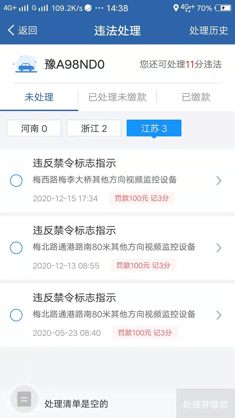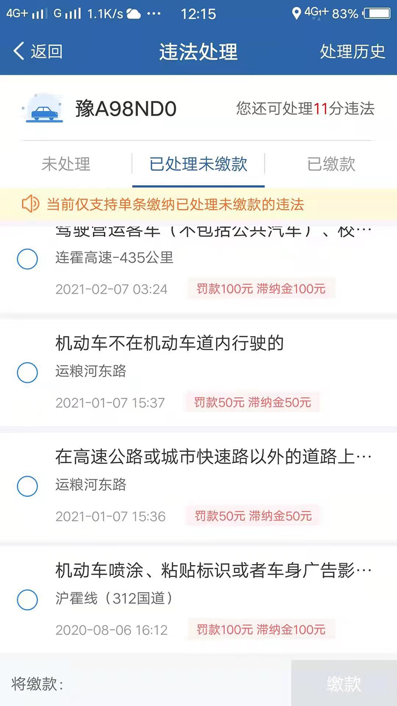 前年年底,荆先生去登录交管12123去查询那辆绑定的车辆的信息,结果吓了一跳,屏幕之上跳出了好几条违章的记录。他认认真真仔细察看,这辆车子从2020年4月一直到12月居然有着5条尚未处理的违法行为,其中涵盖了违停、不礼让行人、违反禁令标志等等情况,累计扣了12分,罚款达到550元。更加麻烦的在于,还有2020年8月、2021年1月以及2月形成的4条已经处理但是未缴款的记录,累计需要缴纳罚款300元,再加上滞纳金300元呐。