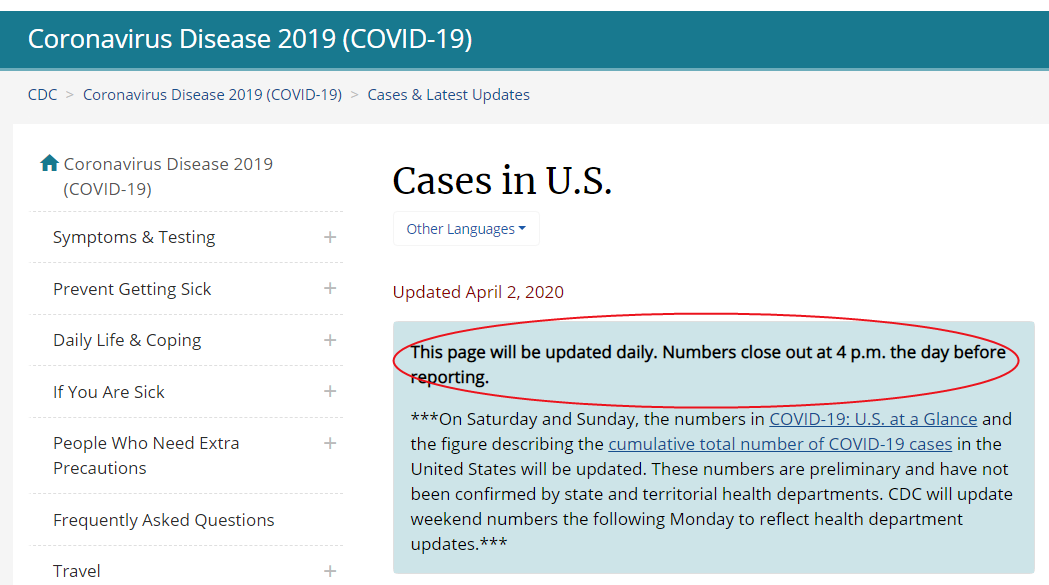 美国疾控中心网站存有疫情页面,其数据截止的时间为当天下午4点,周末的数据会统一延迟到周一才进行更新,这同约翰霍普金斯大学近乎全天实时予以维护的地图相较,差距可不是一点半点。