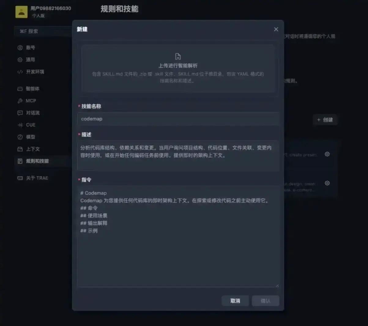 具体究竟该如何去玩呢?以TRAE作为例子来说,整个的过程相较于搭积木而言还要更为简单。倘若你期望让AI来帮你进行UI设计,那么首先要在设置里面找到技能包管理,随后点击新建技能包,接着把需求填写进去,就如同“你是一位资深的UI设计师,在网页布局以及色彩搭配方面颇为擅长”这样,保存之后上传便能够使用了。