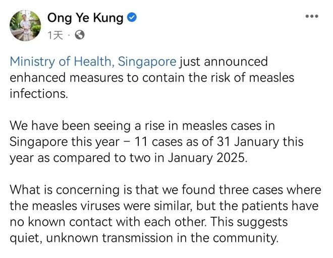 王乙康于脸书给出了一个关键数字,新加坡成年人里存在这样一种状况,约99%的人对麻疹有免疫力,此水平在全球范围内都算得上是处于极高位的情形,而这同样也是政府之所以敢宣称“不会大规模暴发”的底气的来源之处。