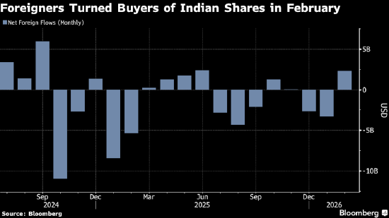 外国投资者在1月撤出33亿美元后,于2月重新成为印度股票的净买家。不过,在多重逆风之下,资金流入依然疲软。