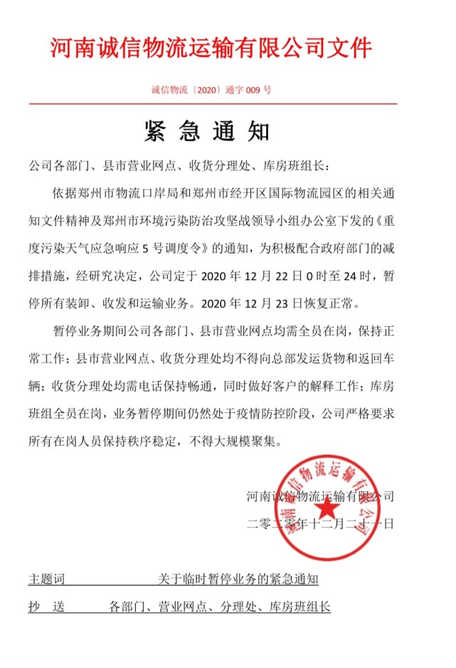 2020年12月22日,郑州市经开区的诚信物流、鸿泰物流等暂停营运一天,细心的商户发现了这一情况。诚信物流董事长杨登攀解释,这是为配合郑州市环境污染防治攻坚而做出的只是短期行为的临时业务调整,和春节放假没有关系。