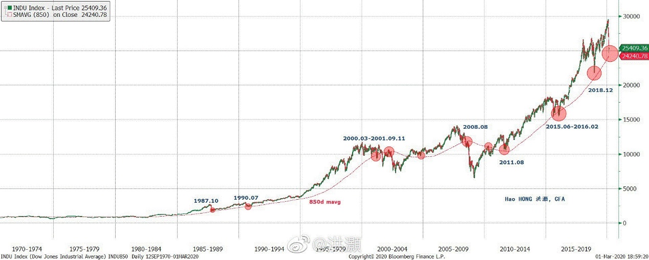 1929年出现了下跌幅度达89%的情况,2000年有跌幅为49%的状况,2008年呈现出下跌57%的态势。这乃是美股历次熊市的真实记载情况。当前标普从高点回落大概30%,放置在百年数据中间仅仅是处于及格的界限范围。洪灏反复着重强调850天均线的意义也正是在于这样的情形状况之处情形:一旦跌穿这条线,那就不是技术调整能够予以解释的数量层级量级了。