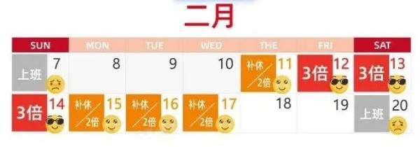 余下的,二月十一日、十五日、十六日与十七日,这四天归属于调休休息日。要是加班,公司要么为你安排补休,要么就需支付两倍的工资。计算薪资时,要记住是按照你本人日均工资的百分之二百或者百分之三百来计算。